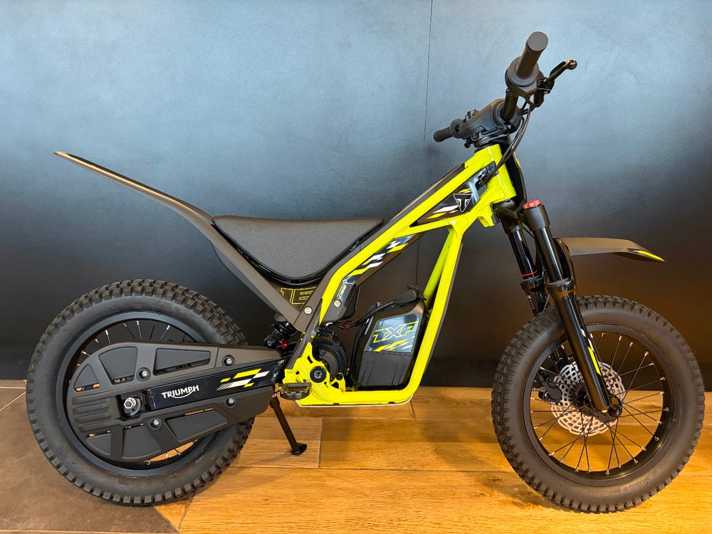 The Triumph TXP-16, powered by OSET, is a premium electric off-road bike for children aged 5–7, described as a "next generation" machine featuring a 765W motor, 43V lithium battery, and 26.6kg weight. UK reviews highlight its dual-mode capability for trials or trail riding, adjustable power, and, significantly, safety features like PIN-protected parental controls and magnetic lanyards.